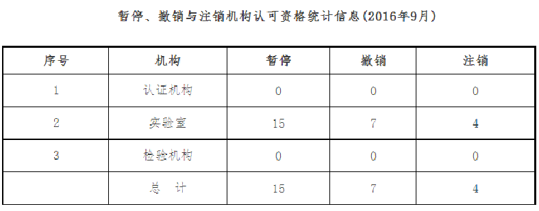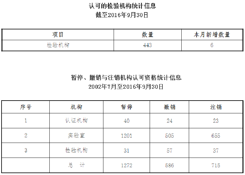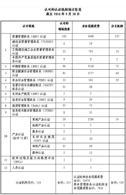 截至2016年9月30日,CNAS认可各类认证机构、实验室及检验机构三大门类共计十四个领域的8319家机构,其中,累计认可各类认证机构150家,认证机构领域总计554个,涉及业务范围类型10476个;累计认可实验室7726家,其中检测实验室6485家、校准实验室881家、医学实验室230家、生物安全实验室68家、标准物质生产者13家、能力验证提供者49家;累计认可检验机构443家。截至2016年9月30日,累计暂停各类机构的认可资格1272家,其中认证机构40家、实验室1201家、检验机构31家;累计撤销各类机构的认可资格586家,其中认证机构24家、实验室505家、检验机构57家;累计注销各类机构的认可资格715家,其中认证机构23家、实验室655家、检验机构37家。